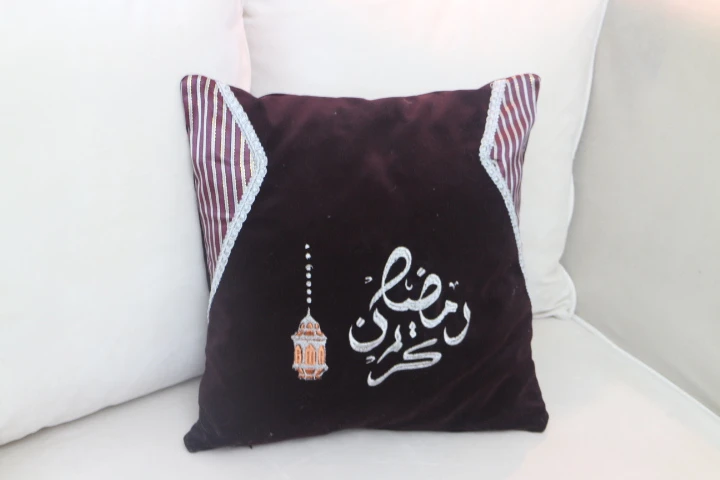 أغطية الوسائد الخاصة برمضان مصنوعة من المخمل ونسيج السايا العربي التقليدي ومطرزة بخيوط فضية وذهبية لتظهر زخارف مستوحاة من رمضان.